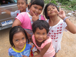 At the Wednesday slum, Aom is teaching the kids a game.